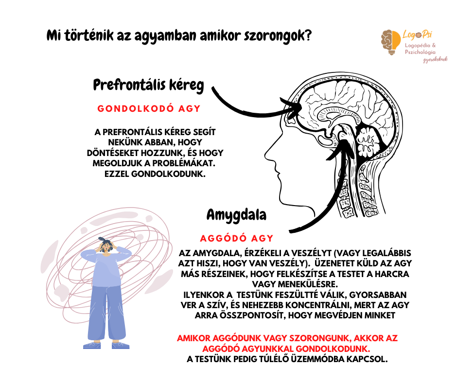 📚 Amikor egy gyerek szorong, az agya úgy reagál, mintha közvetlen veszély fenyegetné – még akkor is, ha valójában semmi ijesztő nem történik. Az agy amygdala nevű része bekapcsolja a „riasztórendszert”, amely a „harcolj vagy menekülj” reakciót váltja ki. Ilyenkor a test feszültté válik, gyorsabban ver a szív, és minden energia a fenyegetés elkerülésére összpontosul.